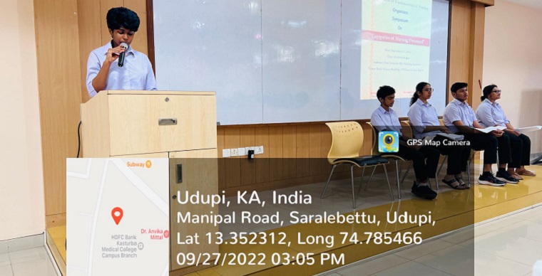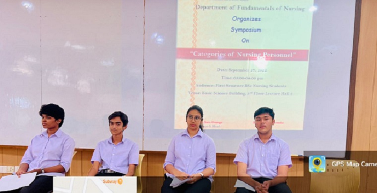 Department of Fundamentals of Nursing organized a Symposium on 27/9/2022 at 3 pm on the topic ‘Categories of Nursing Personnel’ at Lecture Hall 2, 3rd floor, Basic Science Building. Resource Persons were Ms. Cerene Elza Mathew, Mr. Nithin Vinod, Mr. Joel Chacko Reji, and Ms. Rosemi Ann Reji from the First semester of BSc Nursing. Ms. Jennifer Mary Joseph moderated the session.