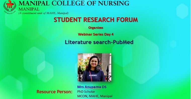 The fourth session of the webinar series was held on 9 January 2021. Ms Pushpa, II year MSc Nursing student was the moderator for the session. Ms Anupama D S, PhD Scholar, Department of OBG Nursing, MCON was the resource person. She deliberated on the topic “Literature search for the database - PubMed”. It was a session with hands-on experience that was held online for the PubMed database through the MS Teams platform. Appropriate time was given for the question-and-answer session. A total of 26 students attended the session, which included faculty members, PhD Scholars, undergraduates, postgraduates and the MPhil Nursing students.