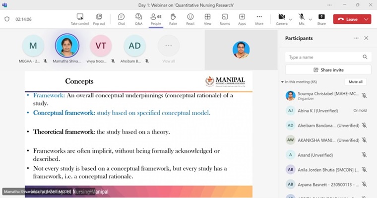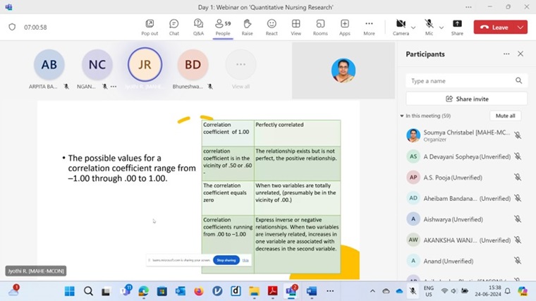 The two-day webinar on ‘quantitative nursing research’ was held between June 24 and 25, 2024, through the Microsoft Teams Online Platform. This was organised by the first-year students of Nurse Practitioner in Critical Care (NPCC) Postgraduate Residency Program, Medical Surgical Nursing Department, in collaboration with Pillar 2 (IoE): Exemplary Research and Innovation of Manipal College of Nursing (MCON), MAHE, Manipal.