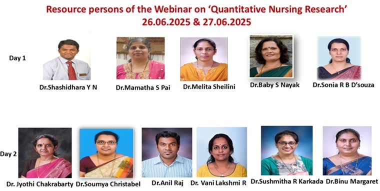 The two days webinar on ‘quantitative nursing research’ was held between June 26 and 27, 2025 through Microsoft Teams online platform. This was organized by the first-year students of Nurse Practitioner in Critical Care (NPCC) Postgraduate Residency Program, Medical Surgical Nursing department, in collaboration with Pillar 2 (IoE): Exemplary Research and Innovation: Undergraduate and Postgraduate vertical of Manipal College of Nursing (MCON), MAHE, Manipal.