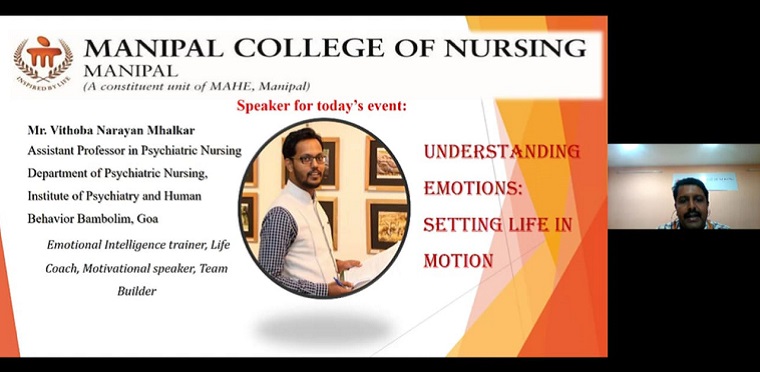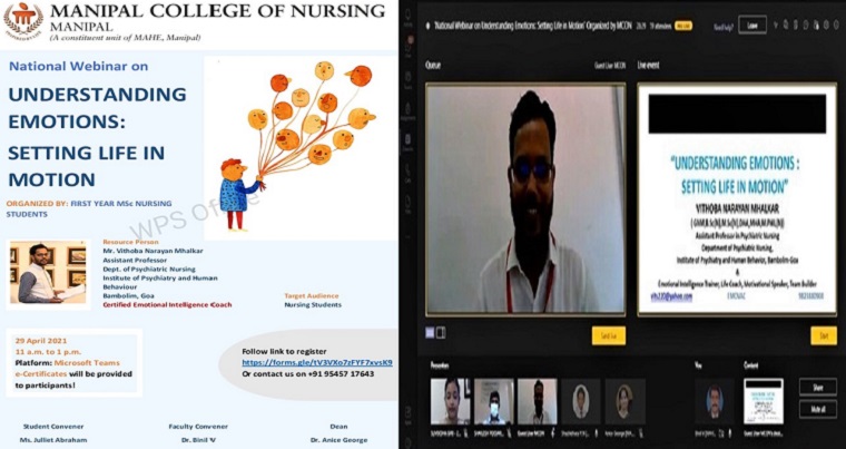 Learning and innovation go hand in hand. Continuous learning is the minimum requirement for success in any field. Considering the valuable input of continuing nursing education and the need for emotional strengthening in the area of the nursing profession, the students of the first year MSc Nursing of Manipal College of Nursing, MAHE, Manipal organized a National webinar on ‘UNDERSTANDING EMOTIONS: SETTING LIFE IN MOTION’ on 29.4.2021 through Microsoft Teams platform. Emotional Intelligence is the ability to recognize emotions in ourselves and others, to understand their effect, and to use that knowledge to guide our thoughts and behaviors, recognizing the need with the current pandemic scenario. This was the ultimate significance of choosing the topic for the webinar.