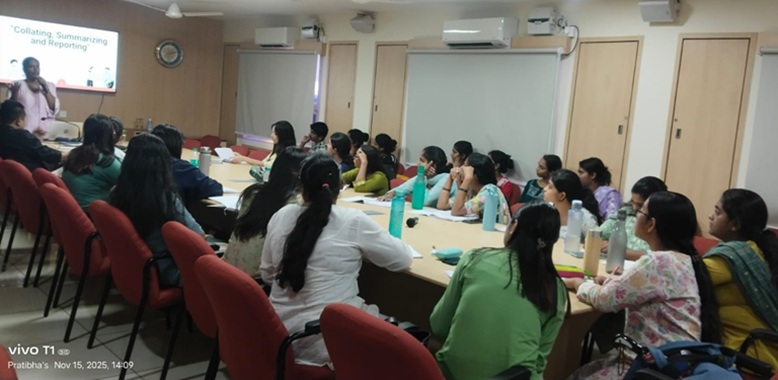 The session, titled “Collating, Summarizing and Reporting,” was led by Ms. Mitchelle Shilpa Lewis, Lecturer, Department of Fundamentals of Nursing, MCON, MAHE. She discussed narrative synthesis, thematic organization of extracted data, and methods of presenting effective results through tables, figures, and summaries. The final session of the workshop, also delivered by Ms. Mitchelle, focused on “Reporting Guidelines for Scoping Review,” where she highlighted the use of the PRISMA-ScR checklist and emphasized the importance of clarity, completeness, and systematic documentation in reporting scoping review findings. She also shared examples of well-reported reviews to illustrate best practices.