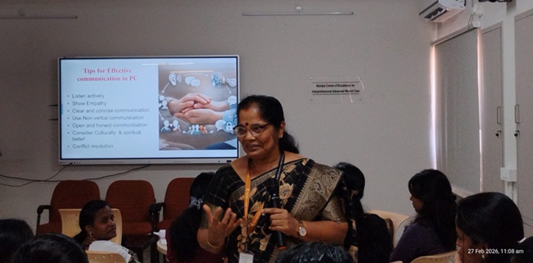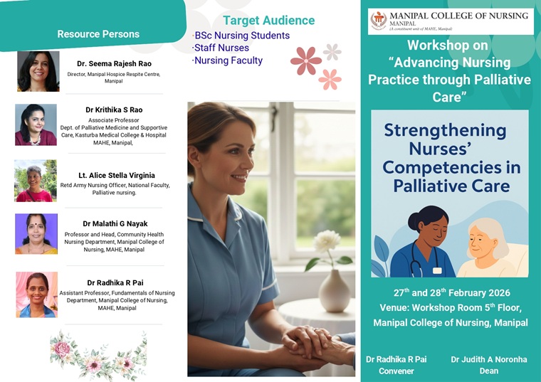 The Department of Fundamentals of Nursing and the Department of Community Health Nursing organized a two‑day workshop titled “Advancing Nursing Practice through Palliative Care” on 27th and 28th February 2026 at Manipal College of Nursing, MAHE, Manipal. The workshop aimed to strengthen nurses’ competencies in delivering holistic and evidence-based palliative care, aligning with SDG 3: Good Health and Well-Being and SDG 4: Quality Education.