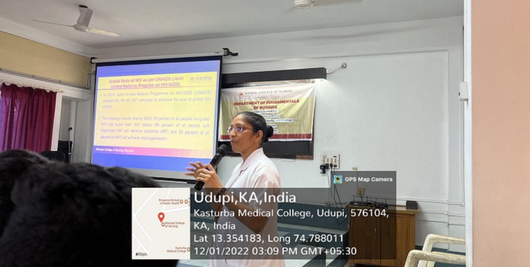 Awareness session about HIV Aids for first Semester BSc Nursing students on the theme ‘Putting Ourselves to the Test: Achieving Equity to End HIV’ on December 1, 2022, at 3 pm was delivered by Dr. Melita Sheilini, Assistant Professor, Selection grade from Department of Medical-Surgical Nursing MCON, Manipal.