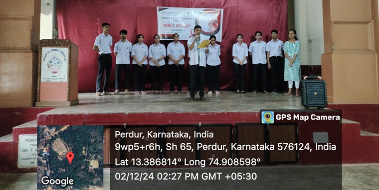 On the occasion of World AIDS Day, the Department of Fundamentals of Nursing, Manipal College of Nursing, MAHE, Manipal, organized an awareness session on HIV/AIDS for first-semester BSc Nursing students. The resource person for the session was Mrs. Charlet Jasmine Vaz, Assistant Professor, MCON, between 9.00 and 10.00 am. The resource person explained the causes, risk habits and transmission, prevention, diagnosis, and treatment. She also mentioned opportunistic infections, ART treatment, and social stigma for people living with HIV. She described two cases and the problems faced by those patients. The session was very informative. A total of 156 students attended and benefited from the session.