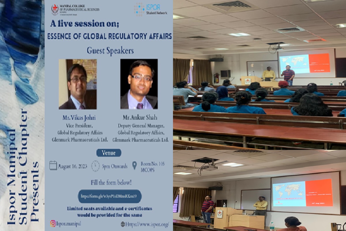 A Guest lecture was jointly organized by ISPOR Manipal Student Chapter and the Department of Pharmaceutical Regulatory Affairs and Management, MCOPS on 16 August 2023. Speakers were Mr Vikas Johri (Vice President, Global Regulatory Affairs, Glenmark Pharmaceuticals Ltd.) and Mr Ankur Shah (Deputy General Manager, Global Regulatory Affairs, Glenmark Pharmaceuticals Ltd.). A short introduction was provided on how regulatory affairs operate in the pharmaceutical industry.
