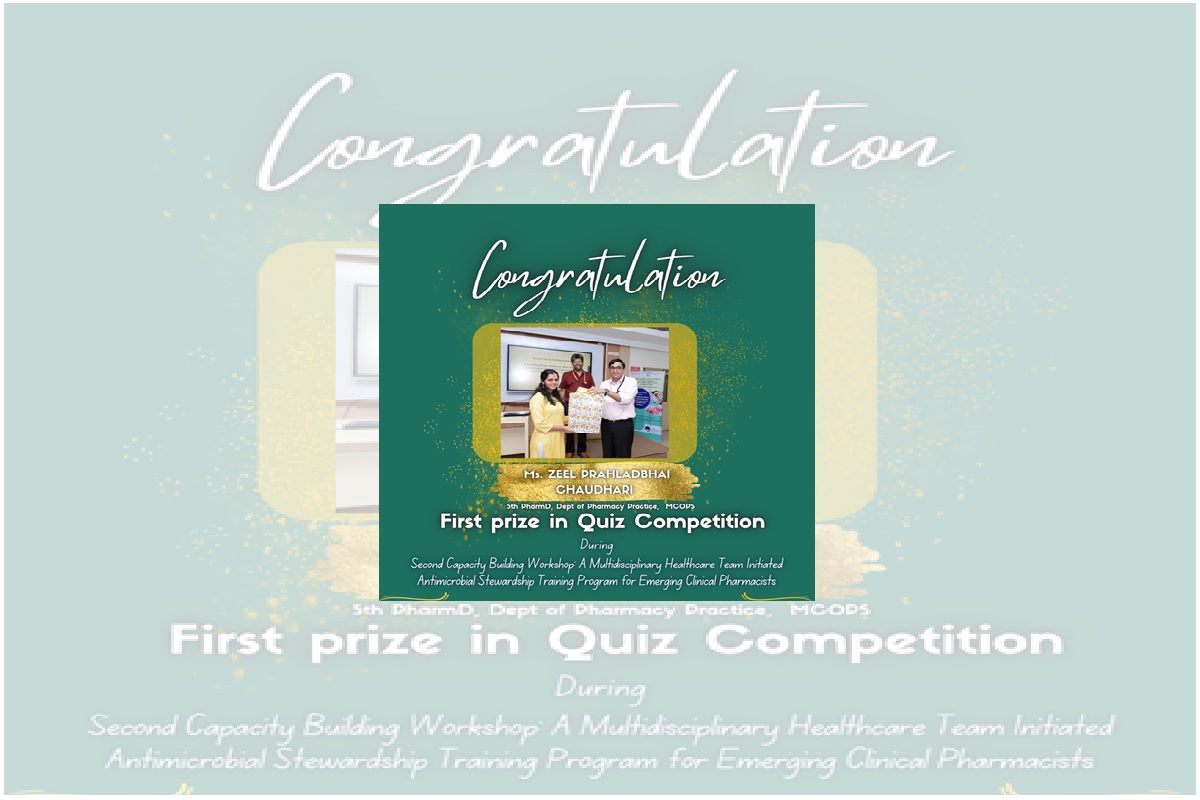 Ms Zeel Prahladbhai Chaudhari, V PharmD student, Dept. of Pharmacy Practice, Manipal College of Pharmaceutical Sciences (MCOPS) won first prize in a Quiz competition during the Second Capacity Building Workshop on “A Multidisciplinary Healthcare Team Initiated Antimicrobial Stewardship Training Program for Emerging Clinical Pharmacists” on 30 September 2023. The workshop was organized by the Center for Antimicrobial Resistance and Education (CARE), Kasturba Medical College, Manipal and Department of Pharmacy Practice, MCOPS, in association with Manipal-bioMérieux Center of Excellence in Antimicrobial Stewardship.