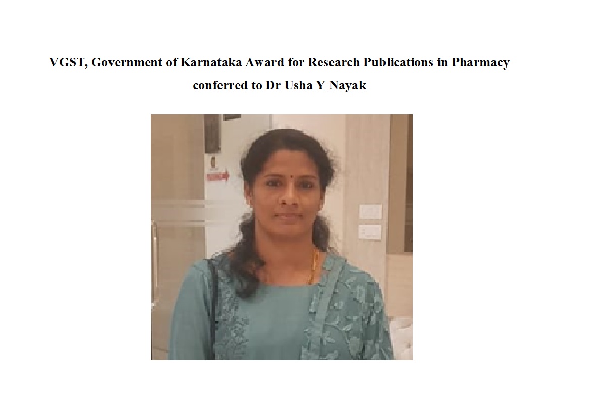 VGST, Government of Karnataka Award for Research Publications in Pharmacy conferred to Dr Usha Y Nayak