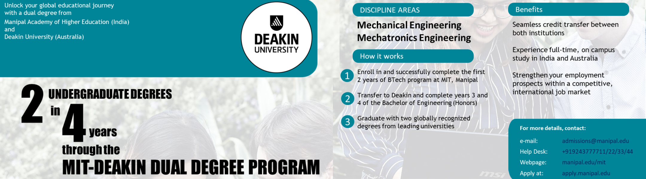Students undertake the first two years of the BTech in Mechanical Engineering at MIT Manipal and then move to Deakin University, Australia, for the final two years of the Bachelor of Engineering (Honours) in Mechanical Engineering. At the completion of four years, students are awarded two degrees—a BTech from MIT Manipal and a Bachelor of Engineering (Honours) from Deakin University—offering enhanced global career opportunities. (Brochure)
