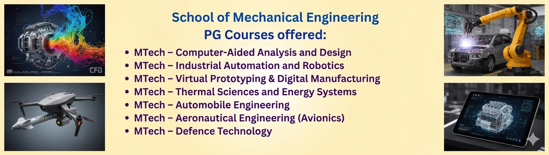 BTech Mechanical Engineering (ME) is a four-year undergraduate engineering degree course offered by the School of Mechanical Engineering. This course provides students with the knowledge and skills necessary to design, analyze, manufacture, and maintain mechanical systems. This course offers core subjects such as theory of machines, design of machine elements, materials engineering, manufacturing processes, additive manufacturing, fluid mechanics, thermal engineering, finite element method, etc. along with a wide range of program electives to strengthen the knowledge of the students. With access to state-of-the-art laboratories and high-end softwares, students are equipped to tackle real-world engineering challenges and stay abreast of the latest technological advancements.