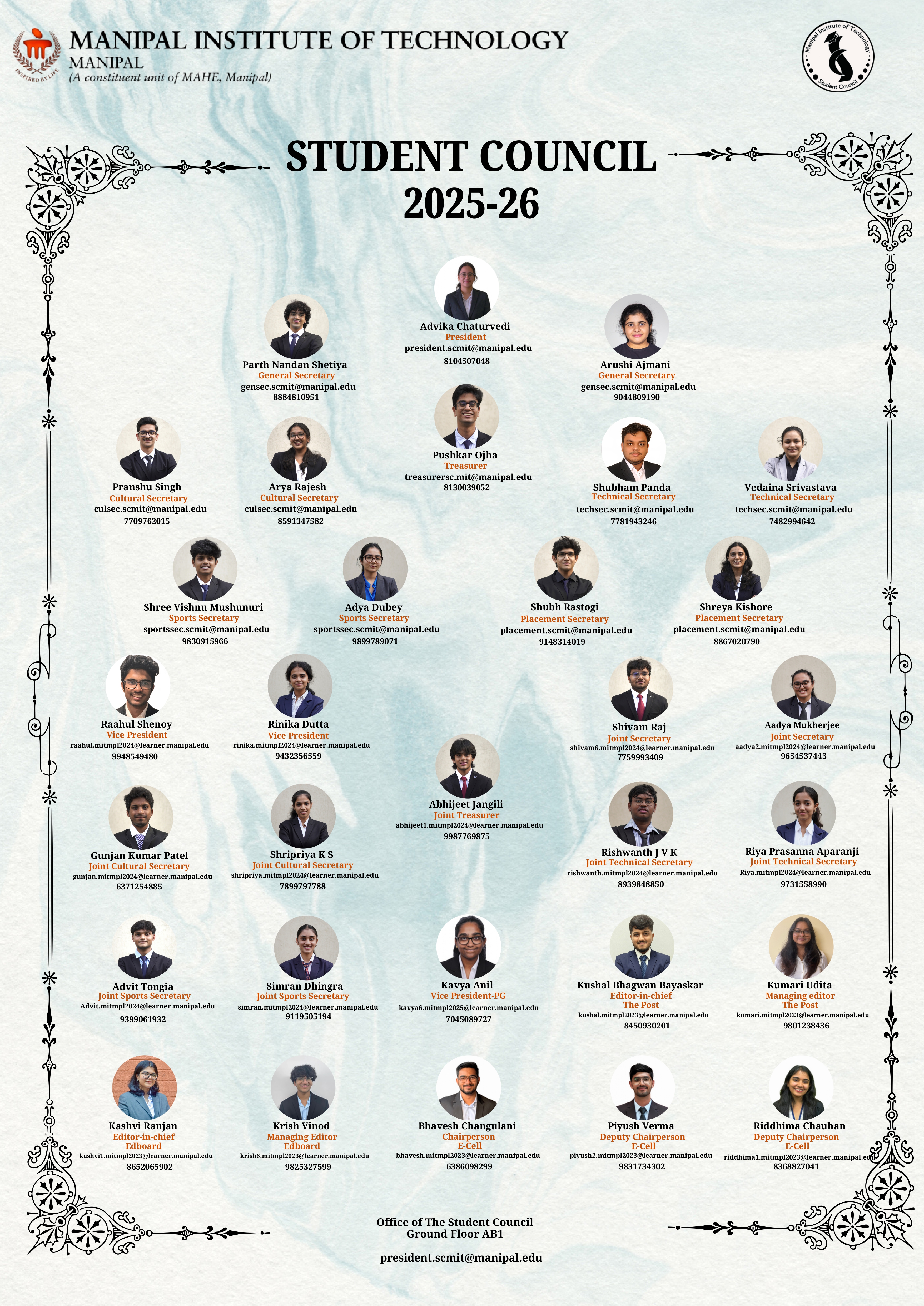 The MIT Student Council works under the Office of Associate Director,  Student Welfare, MIT, Manipal.