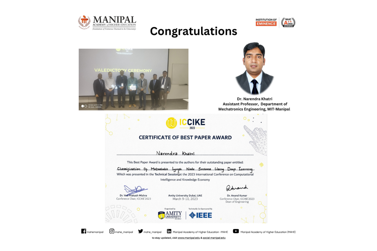 Dr. Narendra Khatri received the Best Paper Award (a certificate with AED 500 cash) at International Conference on Computational Intelligence and Knowledge Economy - ICCIKE2023 for an outstanding research paper presented during the Technical Session-I: Machine Learning & Data Science. The conference is organized by Amity University Dubai, UAE, technically co-sponsored by IEEE UAE during 9-10 March 2023.