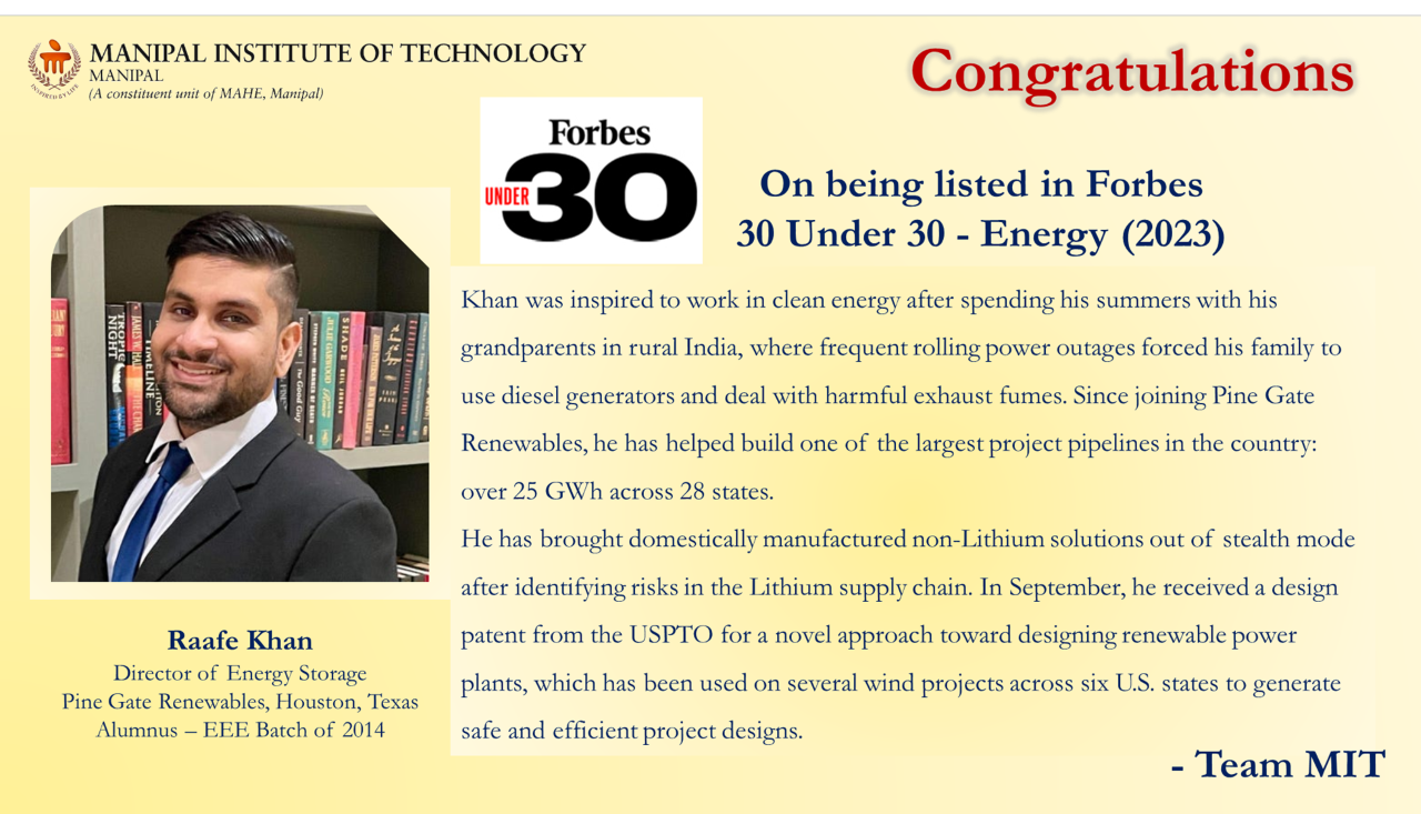 Mr Raafe K, Director-Energy Storage Development and Strategy at Pine Gate Renewables , Alumnus MIT Manipal Batch of 2010 -14 Listed in Forbes 30 under 30 Energy (2023)