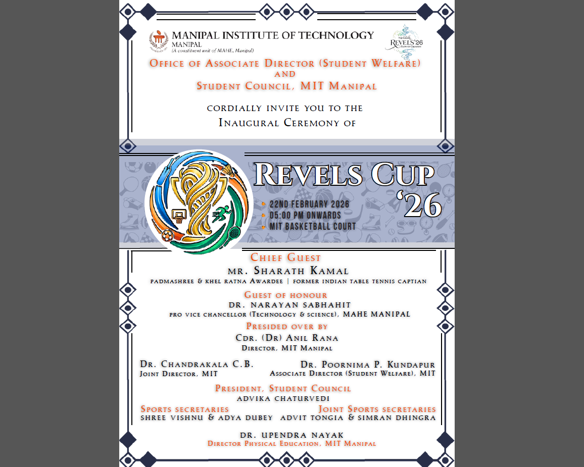 The Manipal Institute of Technology, Manipal proudly presents the Revels Cup '26, scheduled from 22nd February 2026 to 27th February 2026. This much-awaited sporting event brings together enthusiastic participants in a celebration of athletic excellence, teamwork, and sportsmanship.