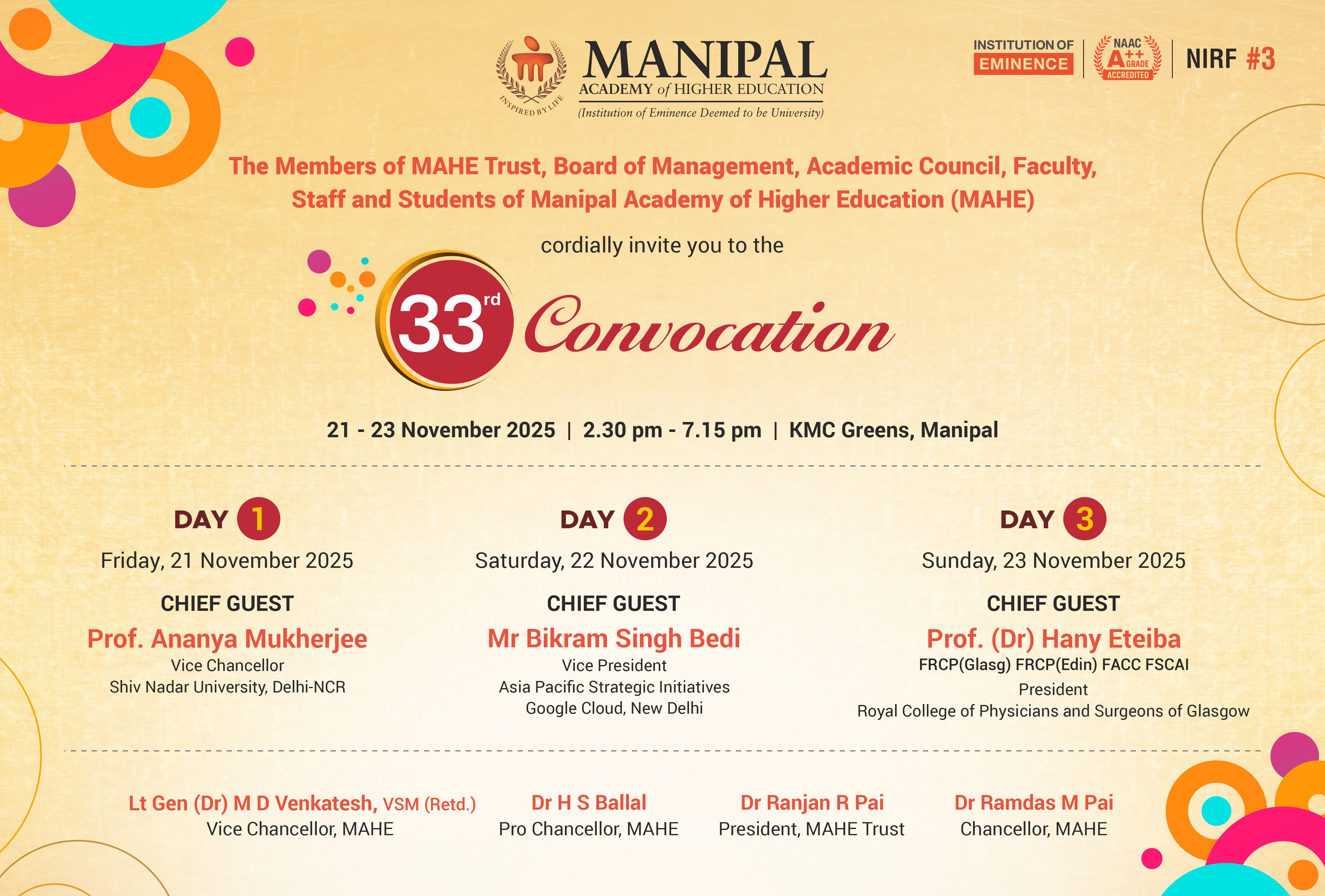 We are pleased to announce that the 33rd Convocation of Manipal Academy of Higher Education (MAHE), Manipal, will be held from November 21 to 23, 2025, at KMC Greens, Manipal. On this occasion, we will honour the achievements of our graduating students as they embark on their future careers and personal endeavours.
