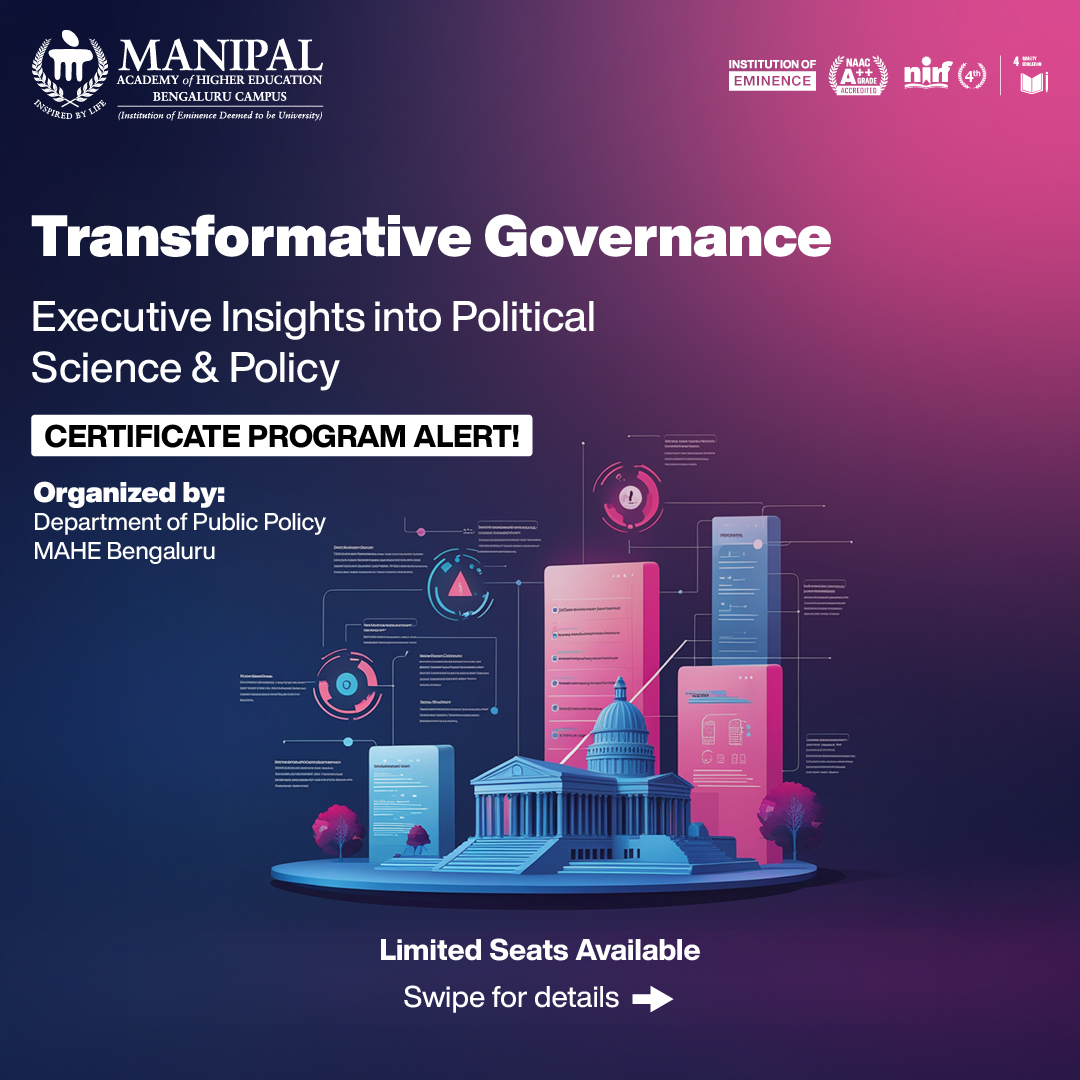 The Department of Public Policy is a constituent unit of the Manipal Academy of Higher Education (MAHE), Bengaluru offers full-time postgraduate and doctoral research programs.