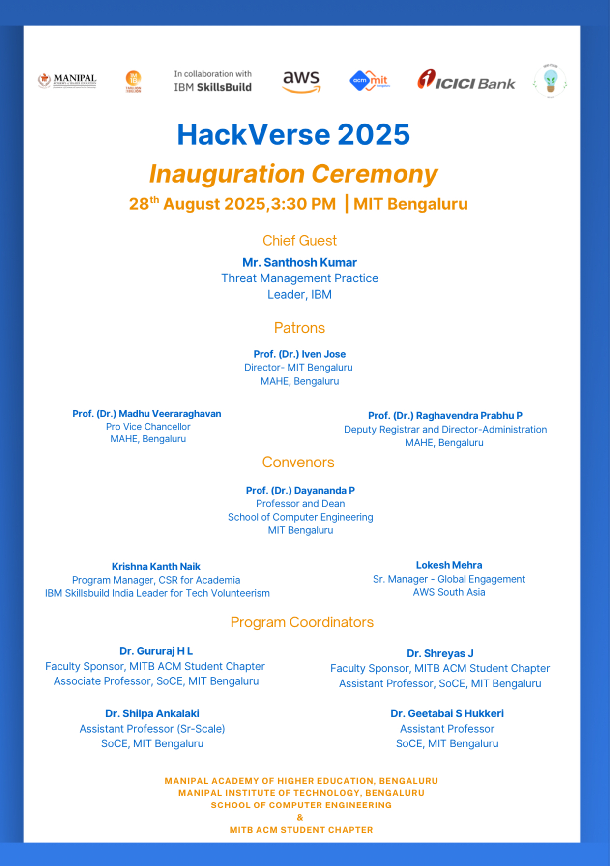 Inaugural of HACKVERSE 2025 organized by school of Computer Engineering, MIT Bengaluru in association with ACM student chapter with Industry partner IBM Skillbuild and AWS.