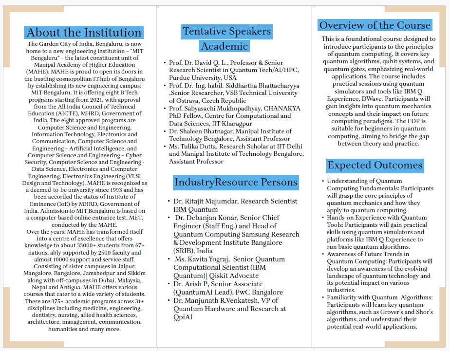 Join us in exploring the transformative field of quantum computing with immersive, hands-on sessions designed to empower your professional growth. This FDP is a valuable opportunity to enhance your skills, expand your knowledge, and stay at the forefront of technological advancement.