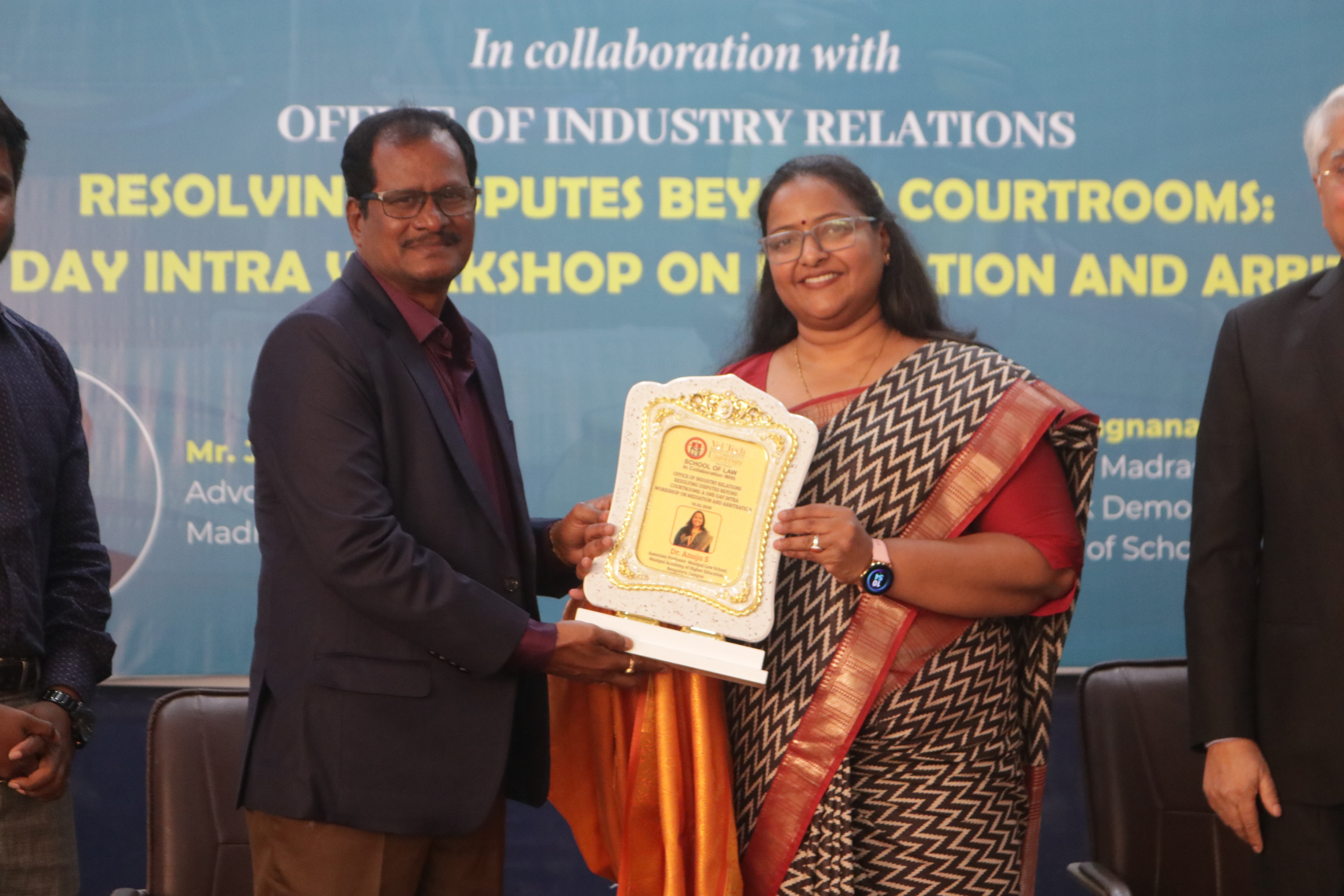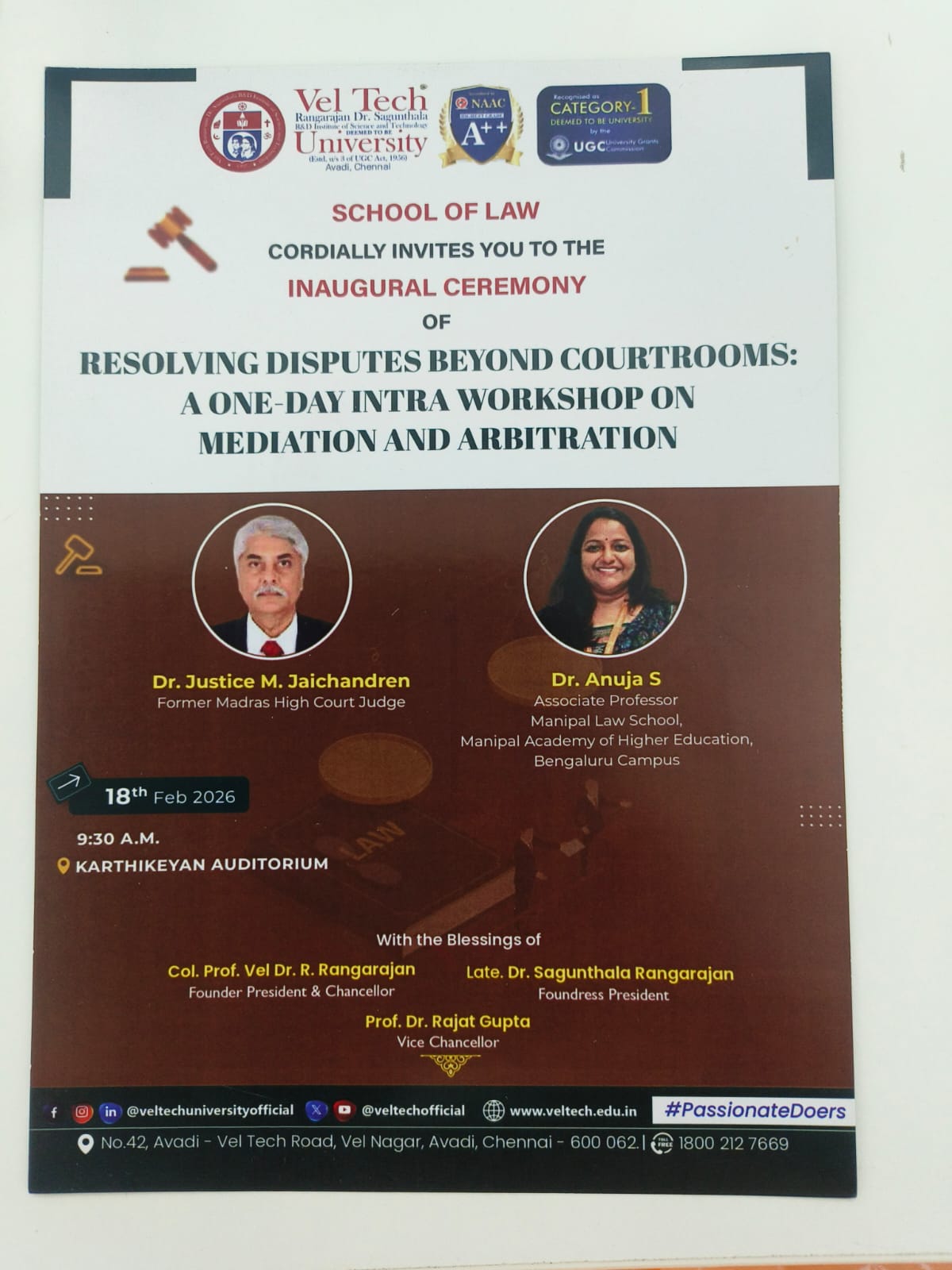 Dr.Anuja.S,Associate Professor, Manipal Law School was invited as Resource Person by School of Law, Vel Tech Rangarajan Dr. Sagunthala R&D Institute of Science and Technology ( Deemed-to-be University ) Vellanur, Tamil Nadu for a One-Day Intra Workshop titled “Resolving Disputes Beyond Courtrooms: Mediation and Arbitration” on 18th February 2026. The workshop aimed to familiarise students and faculty members with the significance of Alternative Dispute Resolution mechanisms, particularly mediation and arbitration, in promoting effective, expeditious, and amicable resolution of disputes beyond conventional court processes. She spoke on the significance of ADR as the appropriate dispute resolution method in the current globalised context and judged the Arbitration and Mediation exercises organised for the students.