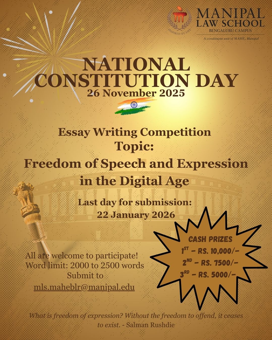 Submissions (2000–2500 words) are open to all (individual participation) and must be submitted by 22 January 2026. The submissions must be sent to mls.maheblr@manipal.edu as a Word/ PDF doc. The file name should be Essay_Constitution Day_Full Name of the Author (e.g. Essay_Constitution Day_Jane Doe), and the subject line must be Essay Competition _ Freedom of Speech and Expression in the Digital Age.