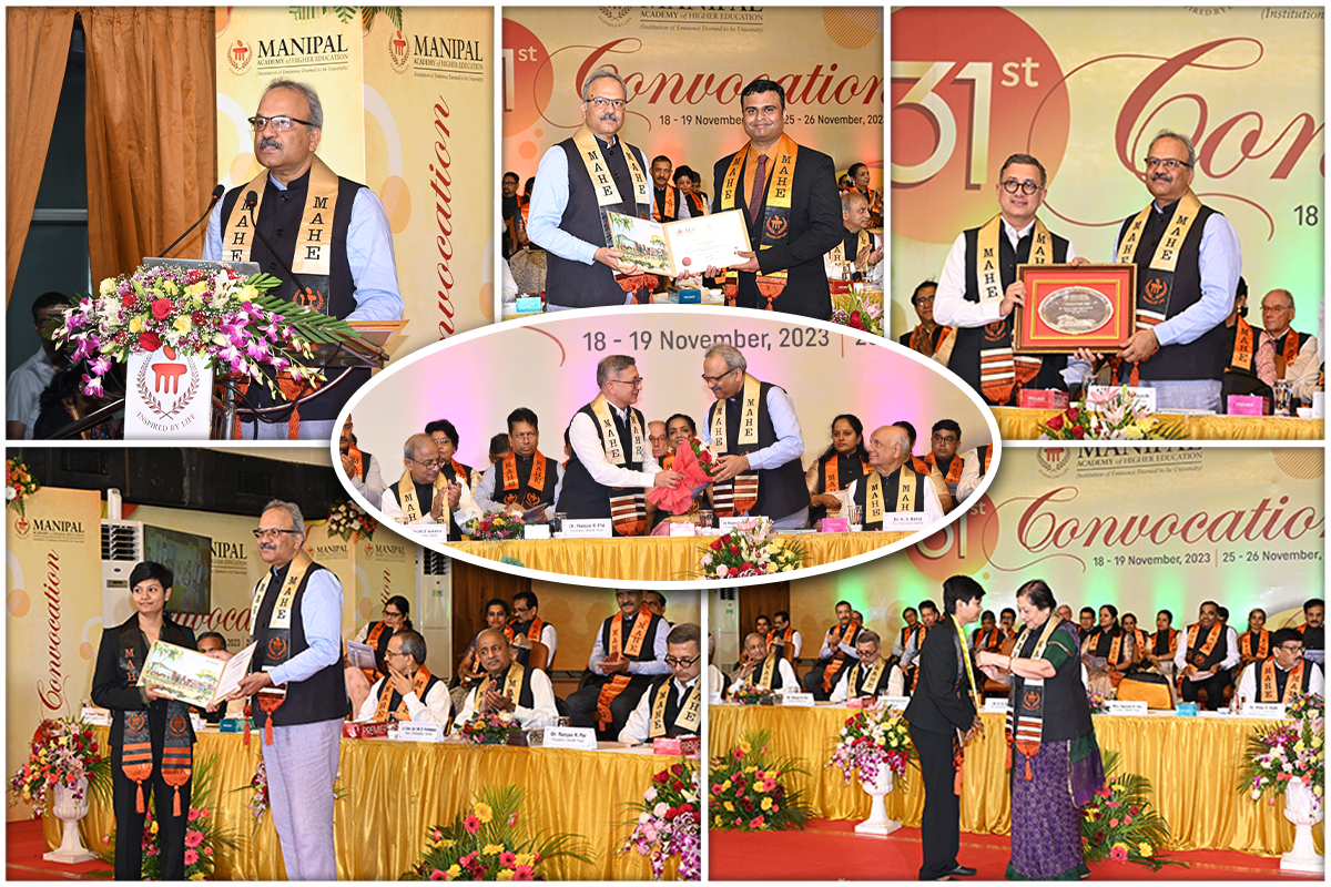 Manipal, 19th November 2023: On day two of Manipal Academy of Higher Education’s (MAHE) 31st Convocation Day on 19 November, distinguished guests graced the occasion to witness the graduation ceremony of the latest cohort. The event celebrated the achievements of the graduates, who were honoured for their academic excellence. Dr Rajeev Singh Raghuvanshi, Drugs Controller General of India (DCGI), Govt. of India, was the chief guest of the day and delivered a stirring convocation address, urging the students to contribute to the nation's fortification and play a vital role in fostering self-reliance.