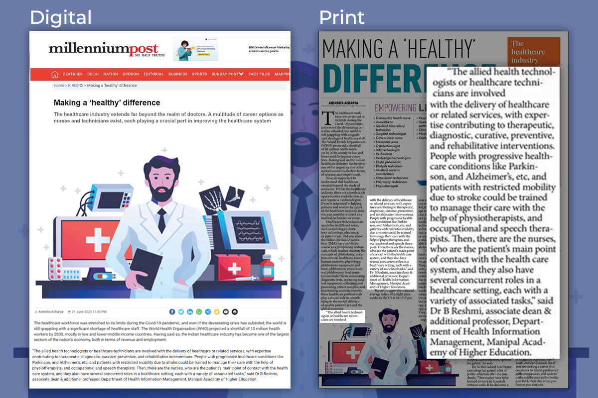 Manipal, 21 June 2023: Dr B Reshmi, Associate Dean & Additional Professor, Department of Health Information Management, Manipal Academy of Higher Education, has shared her views on a career as a healthcare technician with MillenniumPost.