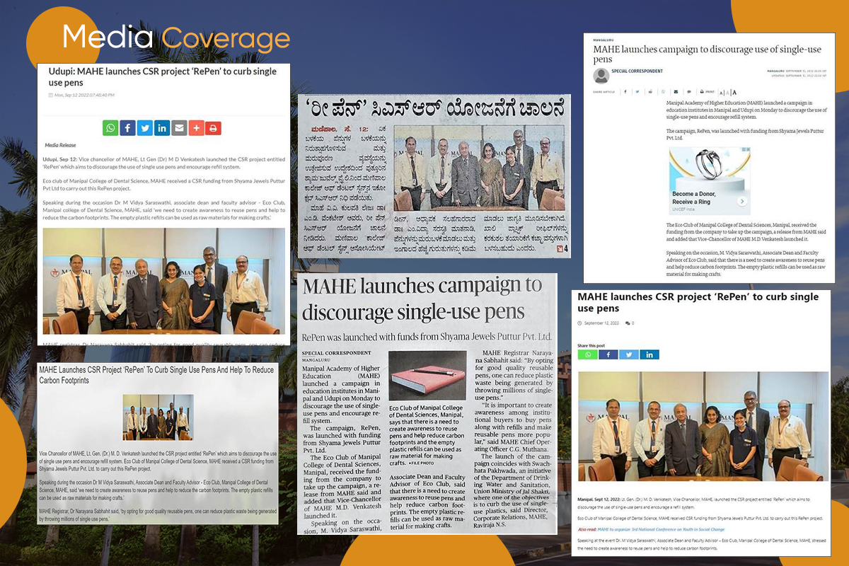Manipal, 12th September: Vice Chancellor of MAHE, Lt. Gen. (Dr.) M. D. Venkatesh launched the CSR project entitled ‘RePen’ which aims to discourage the use of single-use pens and encourage a refill system. Eco Club of Manipal College of Dental Science, MAHE received CSR funding from Shyama Jewels Puttur Pvt. Ltd. to carry out this RePen project.