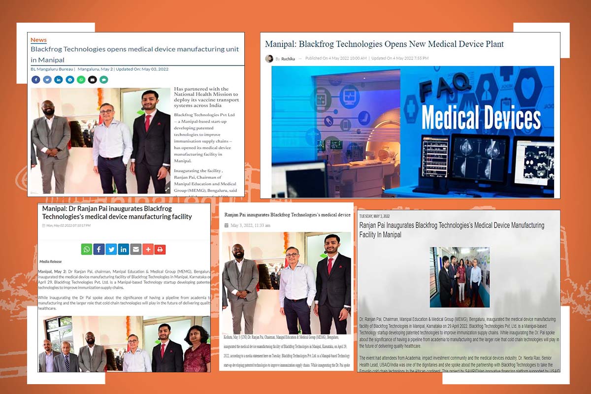 Manipal, 07th May 2022: Dr. Ranjan Pai, Chairman, Manipal Education & Medical Group (MEMG), Bengaluru, inaugurated the medical device manufacturing facility of Blackfrog Technologies in Manipal, Karnataka on 29 April 2022. Blackfrog Technologies Pvt. Ltd. is a Manipal-based Technology startup developing patented technologies to improve immunization supply chains. While inaugurating Dr. Pai spoke about the significance of having a pipeline from academia to manufacturing and the larger role that cold chain technologies will play in the future of delivering quality healthcare.