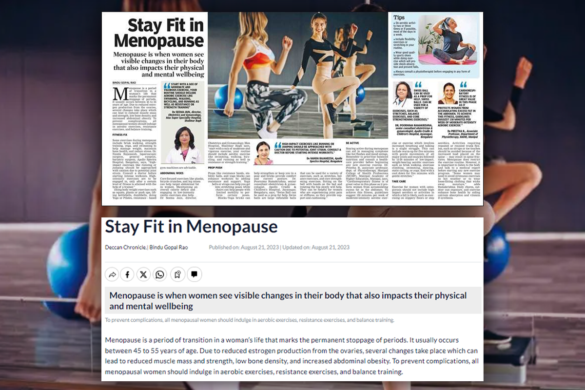 Manipal 21, August 2023: In the article "Stay Fit in Menopause", valuable insights are given by Dr Preetha R, Associate Professor, Department of Physiotherapy, Manipal College of Health Professions (MCHP), Manipal.