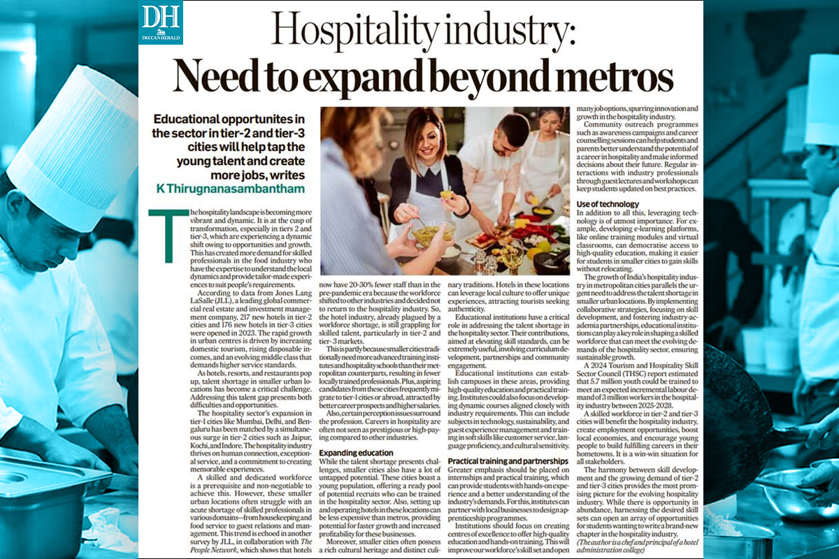 In the article, Chef Thirugnanasambantham discussed how educational institutions play a pivotal role in addressing the talent shortage in the hospitality sector, especially as Tier 2 and Tier 3 cities undergo rapid transformation driven by emerging opportunities.