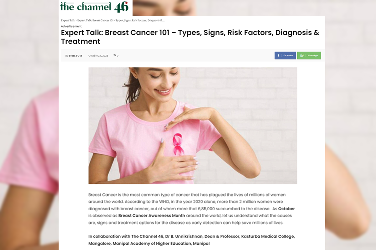 Manipal 28th October 2022: The author's article on "Breast Cancer 101 – Types, Signs, Risk Factors, Diagnosis & Treatment" co-authored by Dr. B. Unnikrishnan, Dean & Professor, Kasturba Medical College (KMC), Mangalore, and Dr. Ramesh Holla, Associate Professor of Community Medicine, Kasturba Medical College (KMC), Mangalore.