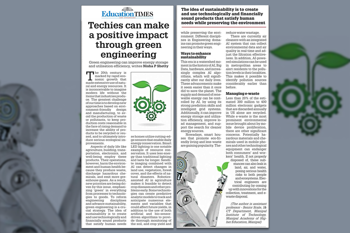 Manipal, 16th May 2023: The author’s article, Techies can make a positive impact through Green Engineering, by Nisha P Shetty, Assistant Professor - I & CT Department, Manipal Institute of Technology (MIT), MAHE, Manipal.