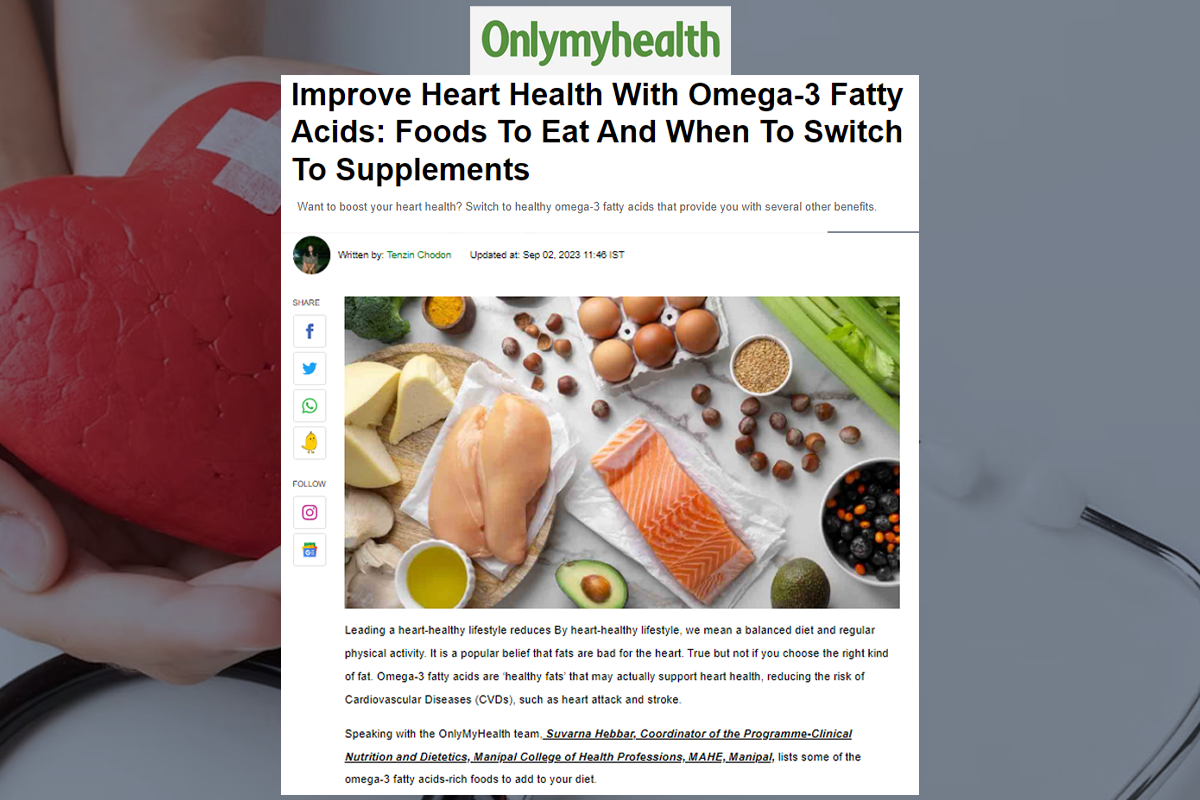 Manipal, 2nd September 2023: The author's article, “Improve Heart Health With Omega-3 Fatty Acids: Foods To Eat And When To Switch To Supplements”, by Suvarna Hebbar, Coordinator of the Programme-Clinical Nutrition and Dietetics, Manipal College of Health Professions (MCHP), Manipal.