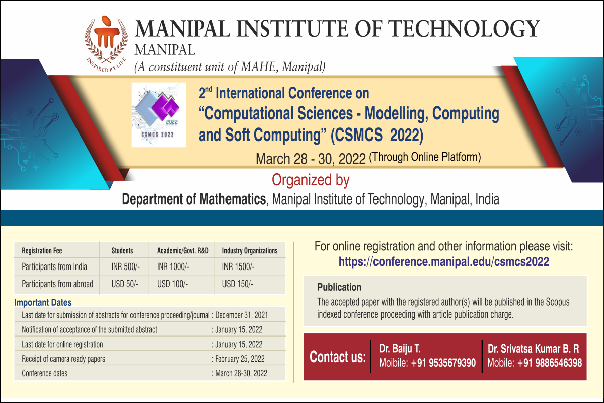 Department of Mathematics, Manipal Institute of Technology, (MIT) Manipal will be organizing the “2nd International Conference on Computational Sciences- Modelling, Computing and Soft Computing (CSMCS-2022)” from March 28th to 30th 2022. The conference will be held in Virtual Mode.