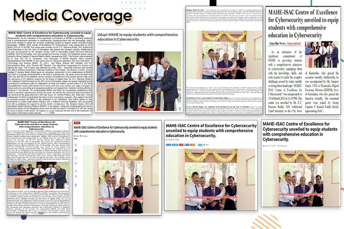 Manipal 24, March 2023: As an indication of the significant commitment of MAHE to providing students with a comprehensive education in cybersecurity, equipping them with the knowledge, skills, and tools needed to tackle the complex challenges posed by today's rapidly evolving threat landscape “ MAHE- ISAC Center of Excellence for Cybersecurity” was inaugurated on 23rd March 2023 at 12.45 PM. The center was unveiled by Dr. E.V. Ramana Reddy, IAS, Additional Chief Secretary to the CM, Govt of Karnataka, who graced the occasion virtually. Additionally, he was accompanied by Mr. Sanjeev Gupta, CEO of Karnataka Digital Economy Mission (KDEM), Govt of Karnataka, who also graced the function virtually. The esteemed guests were joined by Group Captain P Aanand Naidu (Retd), representing ISAC.