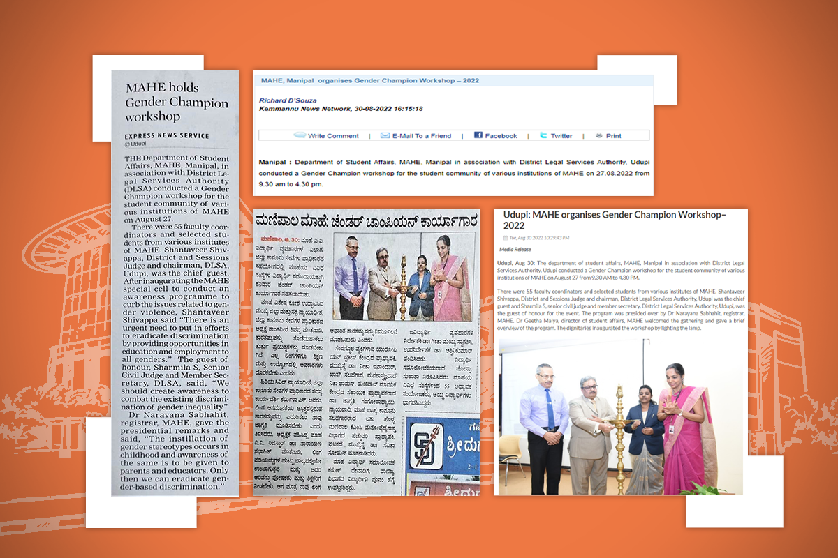 Manipal, 29th August 2022: Department of Student Affairs, MAHE, Manipal in association with District Legal Services Authority, Udupi conducted a Gender Champion workshop for the student community of various institutions of MAHE on 27.08.2022.