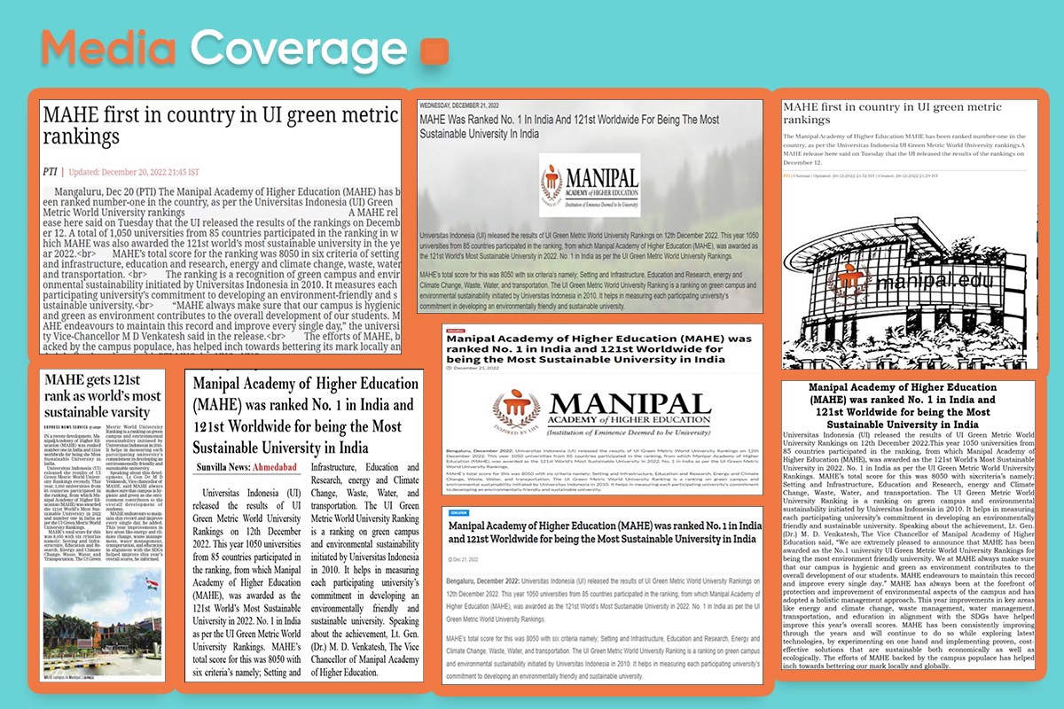 Manipal, 20th December 2022: Universitas Indonesia (UI) released the results of UI Green Metric World University Rankings on 12th December 2022. This year 1050 universities from 85 countries participated in the ranking, from which Manipal Academy of Higher Education (MAHE), was awarded as the 121st World’s Most Sustainable University in 2022. No. 1 in India as per the UI Green Metric World University Rankings.
