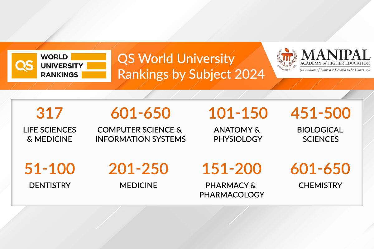 Manipal; 13 April 2024: Manipal Academy of Higher Education (MAHE) is proud to achieve new rankings by Quacquarelli Symonds World University Ranking 2024. MAHE has been ranked in two narrow subjects, specifically Dentistry and Anatomy and Physiology, which fall under the Life Sciences and Medicine category.