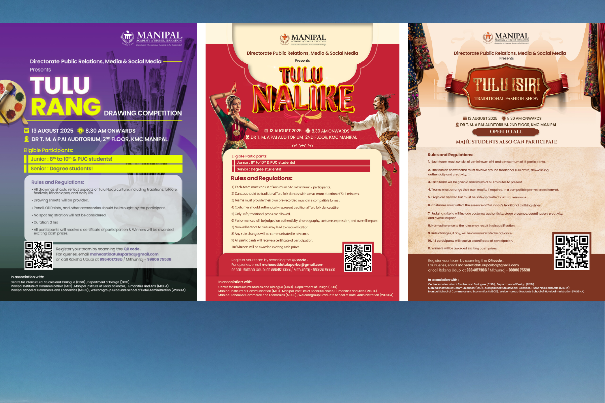 This cultural extravaganza is scheduled for August 13th, 2025, from 9:30 AM to 6:00 PM at Dr. T.M.A Pai Hall, Manipal. The event welcomes students, the local community, and international visitors, aligning with MAHE’s mission to foster cultural connections and promote appreciation for regional heritage. Attractive prizes will be awarded to the winners of all competitions.