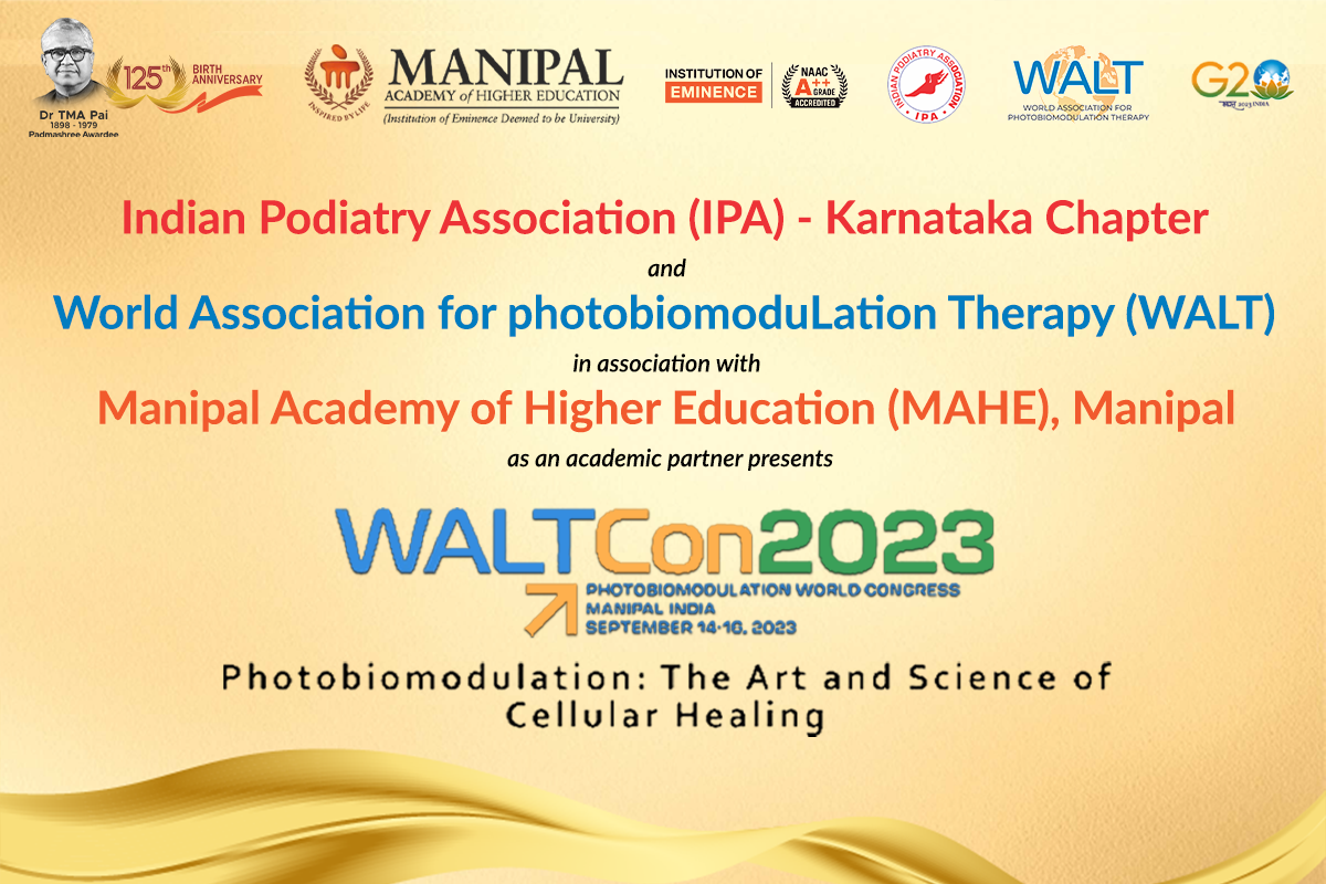 Manipal; 13 September 2023: Manipal Academy of Higher Education, in academic partnership with the World Association for PhotobiomoduLation Therapy (WALT) and Indian Podiatry Association (IPA), Karnataka Chapter – is jointly organising “World Association for photobiomoduLation Therapy (WALT) Congress 2023” the first time in India. The Congress will be held between 13th to 16th September at Fortune Inn Valley View Hotel, Manipal, with the theme “Photobiomodulation: The Art and Science of Cellular Healing”. The organising chairpersons for WALTCon2023 will be Dr. G Arun Maiya, Dean & Professor, MCHP, Chief-CDFCR, President-IPA Karnataka Chapter, Membership Director-WALT and Dr. A. P. S Suri, National President of IPA, India’s Leading Podiatric Surgeon.