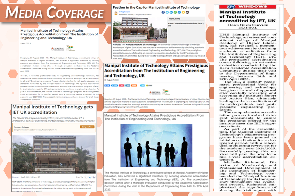 Manipal 05 August 2023 - The Manipal Institute of Technology, a constituent college of Manipal Academy of Higher Education, has achieved a significant milestone by securing academic accreditation from The Institution of Engineering and Technology (IET), UK. The accreditation decision comes after a thorough evaluation conducted by the Academic Accreditation Committee during the visit to the Department of Engineering from 24th to 27th April 2023.