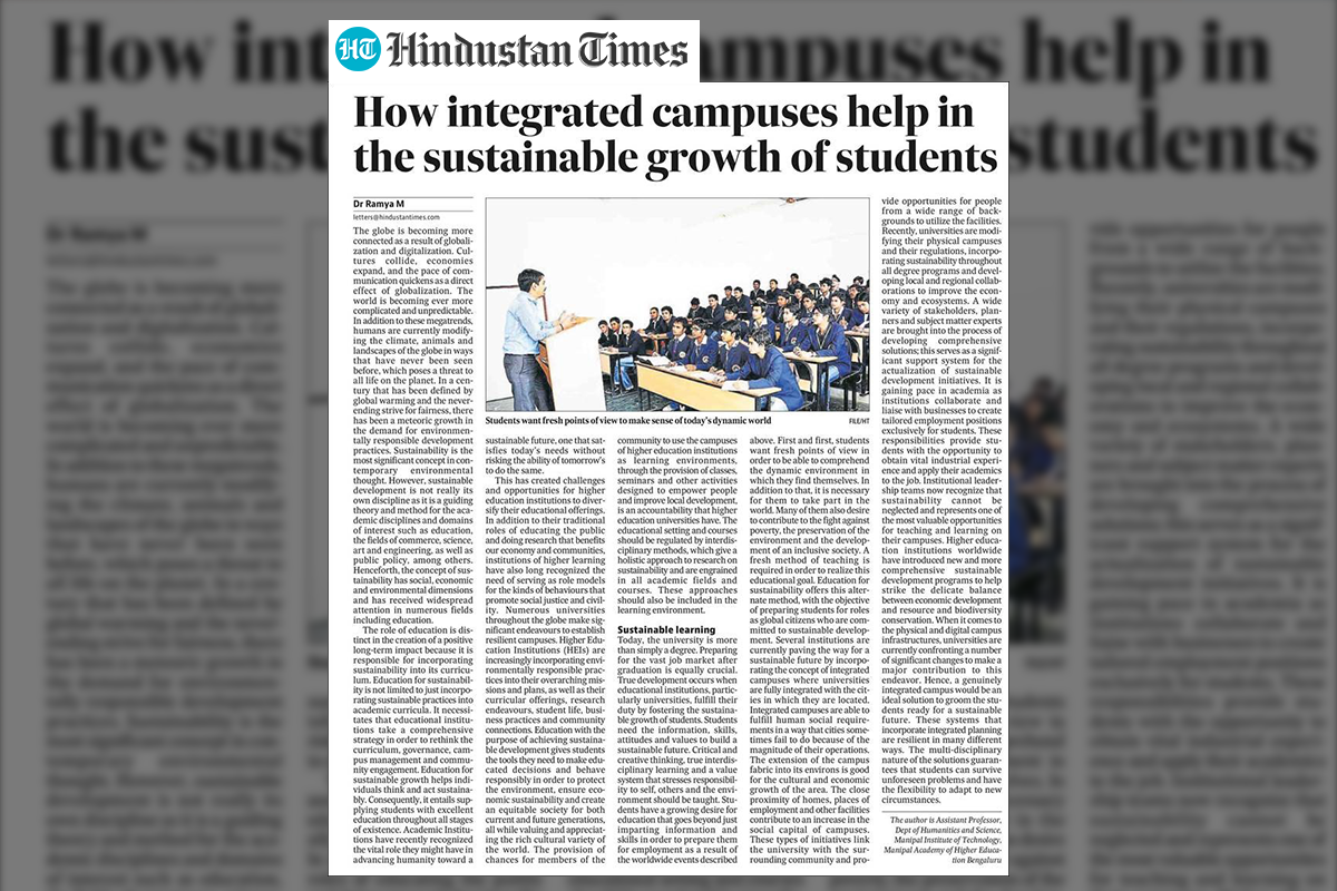 Manipal, 01 June 2023: Dr Ramya M, Assistant Professor, Dept of Humanities and Science, Manipal Institute of Technology (MIT), Bengaluru, shared her views on “Role of integrated campuses for sustainable growth of Students” with Hindustan Times (HT).