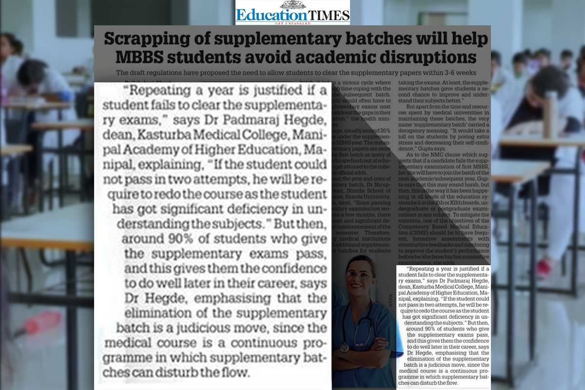 Manipal, 03rd July 2023: Dr Padmaraj Hegde, Dean, Kasturba Medical College (KMC), Manipal, shared his valuable insights on “Scrapping of supplementary batches will help MBBS students avoid academic disruptions” with Education Times (TOI).