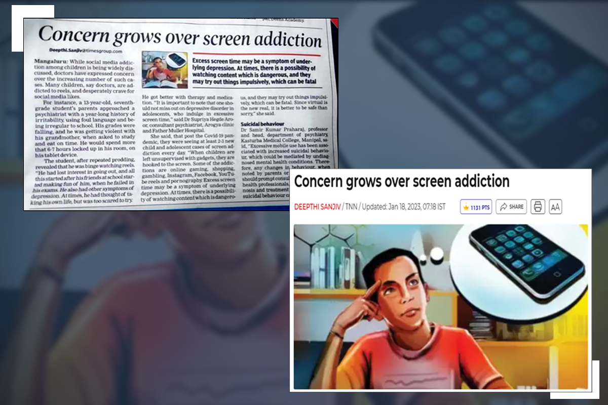 Manipal 18th January 2023: In the article, "Concern grows over screen addiction", valuable insights are given by Dr Samir Kumar Praharaj, Professor and Head, Department of Psychiatry, Kasturba Medical College (KMC), Manipal.
