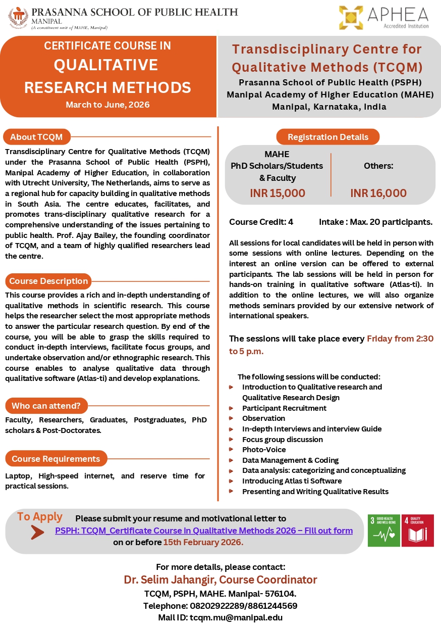 Prasanna School of Public Health seeks to facilitate and pursue new research initiatives that cut across the traditional disciplinary lines enhancing the research capacity through academic and outreach initiatives. PSPH has created inter-disciplinary research units to build research appetite among its faculty and students and to develop networks with researchers, research centers building, industry and community.