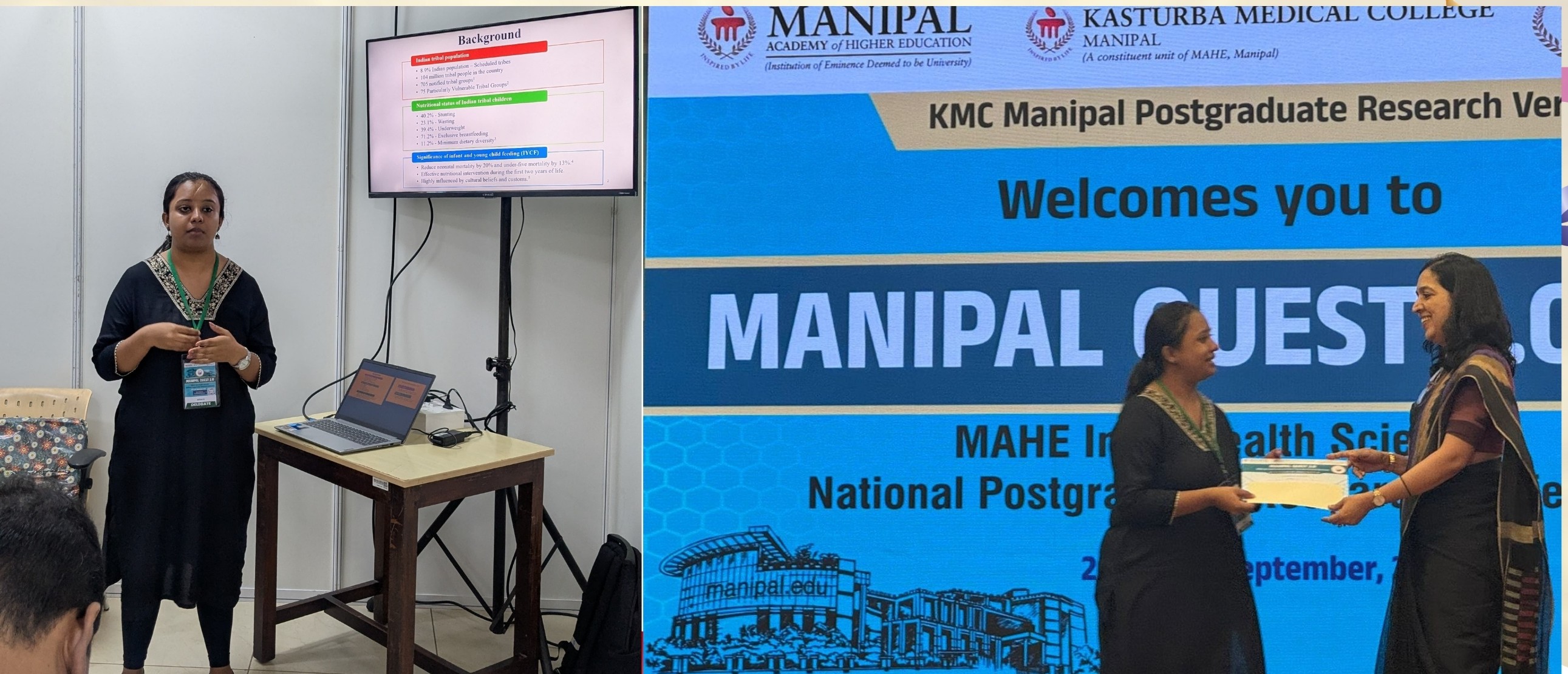 Dr Rithu S (PhD Research Scholar, Prasanna School of Public Health [PSPH]) secured second place in the scientific oral presentation for presenting her research work titled "A scoping review on interventions aimed at improving infant and young child feeding practices among Indian tribes", co-authored by Ms Anusree Prabhakaran, Dr Divya Sussana Patil, and Dr Arathi P Rao, at the Manipal Quest 2.0 (MAHE Inter-Health Sciences National Postgraduate Research Conference), organised by Kasturba Medical College, MAHE, Manipal on September 21, 2025.