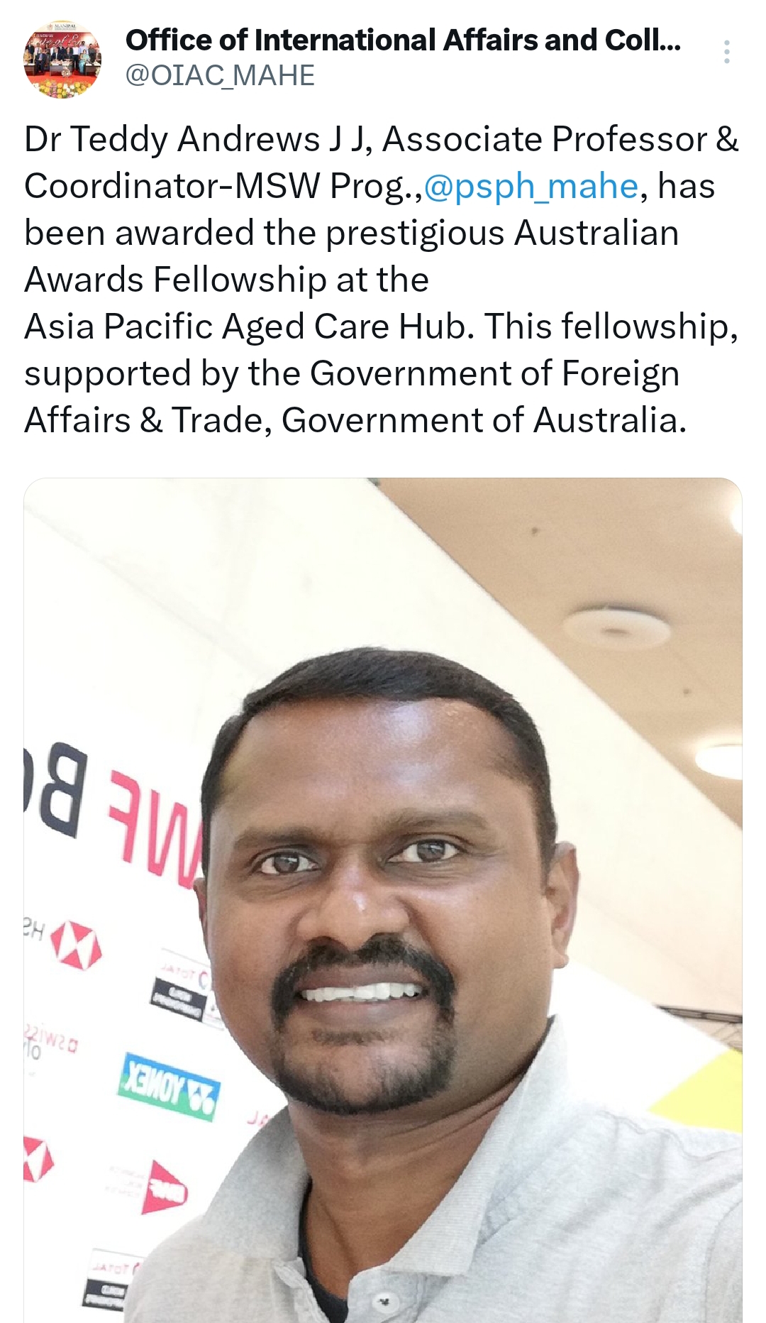 Dr Teddy Andrews J J, Coordinator, MSW Programme, DoSHI, PSPH, has been Awarded the Prestigious Australian Awards Fellowship at the Asia Pacific Aged Care Hub, Australia. This fellowship is supported by the Government of Foreign Affairs and Trade, Government of Australia. This is a joint initiative of Aged Care Research and Innovation Industry Australia (ARIIA) and Flinders University. Dr Teddy Andrews J J will be joining a distinguished group of achievers from six countries to develop leadership and build influential networks within the aged care sector.