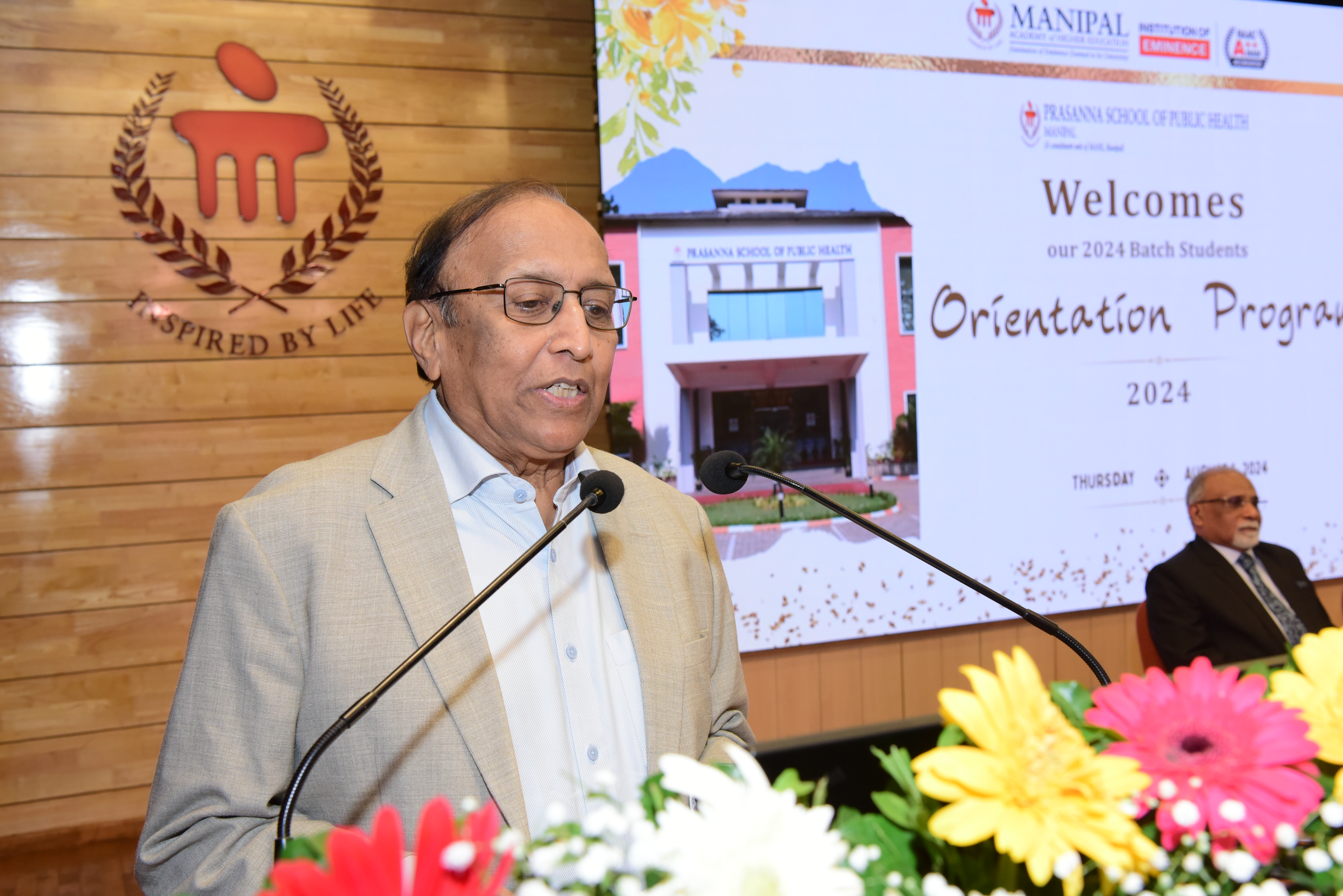 Shri D A Prasanna, Chief Patron of PSPH, MAHE was the chief guest, delivered an inspiring address, urging students to pay keen attention to their studies with dedication and commitment. He stressed the importance of acquiring skills in public health communication, counselling, and data analysis. Shri Prasanna encouraged students to develop a confident attitude, embrace diverse subjects, define problems accurately, cultivate a problem-solving mindset, and build meaningful relationships.
