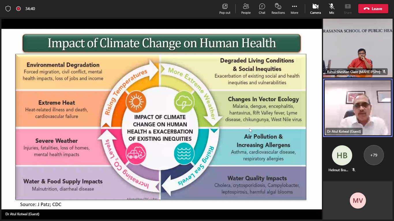 Maj Gen (Prof) Atul Kotwal, Executive Director, National Health Systems Resource Centre, Ministry of Health and Family Welfare, Govt of India was the speaker and Dr Sanjay Pattanshetty, Head of the Department, Department of Global Health Governance was the moderator. Various factors affecting climate change, air, water, food, environment, human health, eco-friendly renewable energies, wellness etc. were discussed.