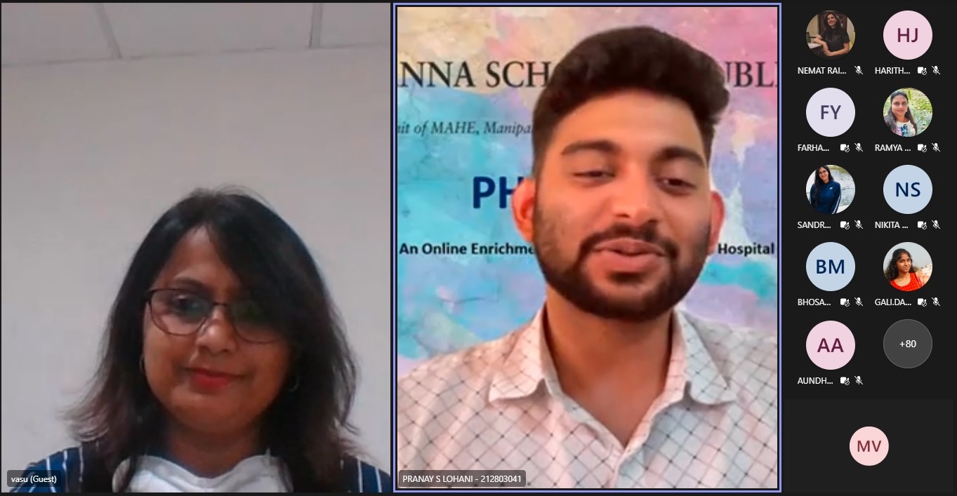 Career counselling cell, Prasanna School of Public Health had organized PHRONESIS & EGERIA– an online interactive learning workshop on diverse range of topics by industry professionals for the students. CV writing and one-on-one mock interview were also conducted.
